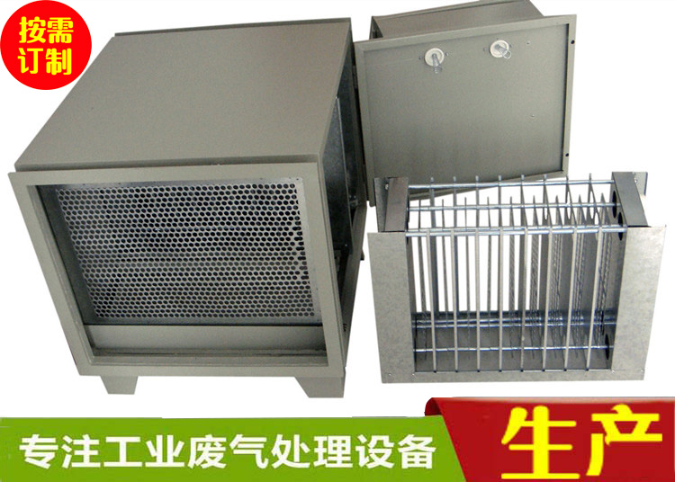 LW系列油煙凈化器為二級(jí)式靜電吸附型,用來去除細(xì)微粒徑的碳?xì)浠衔锖推渌諝庵械碾s粒。它的二級(jí)式是指電離段與收集段,每個(gè)電離段由一系列鎢鋼線組成,安裝在一系列接地板中間,并通給高壓直流電。大氣中的微粒在通過電離器的強(qiáng)力靜電場(chǎng)時(shí),被電離并帶有正或負(fù)電荷。