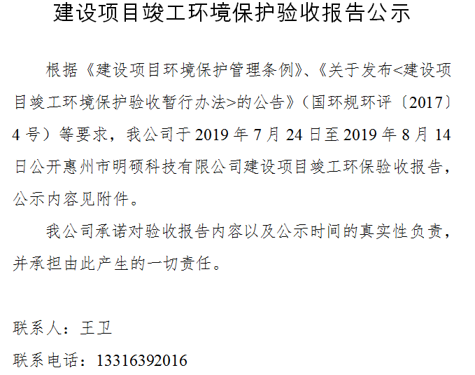惠州宏利達(dá)科技環(huán)保驗(yàn)收公示|惠州環(huán)保公司|惠州環(huán)保公示平臺(tái)